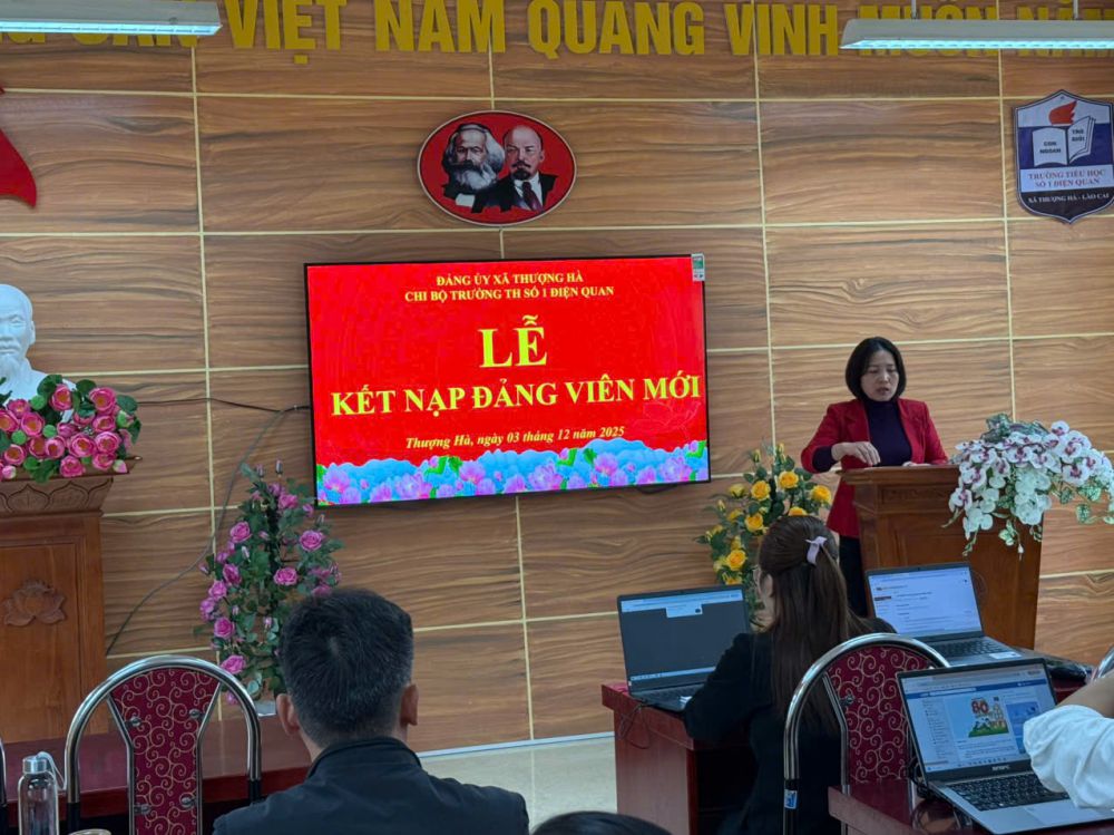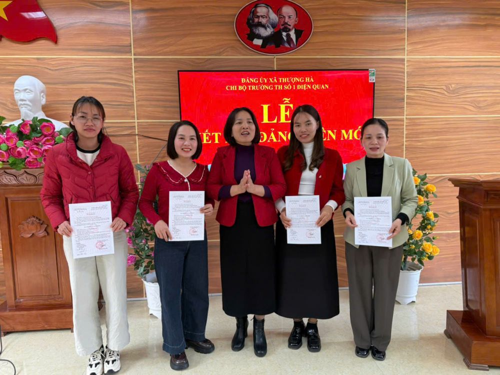 Chiều ngày 03 tháng 12 năm 2025, trong bầu không khí trang nghiêm, ấm áp và đầy tự hào, Chi bộ Trường Tiểu học số 1 Điện Quan, xã Thượng Hà đã long trọng tổ chức Lễ kết nạp Đảng viên mới cho bốn quần chúng ưu tú: Khổng Thị Lan Hương, Trương Thị Mỹ Linh, Lý Thị Vân và Nguyễn Thị Liên. Buổi lễ được tổ chức trên cơ sở chỉ đạo và sự nhất trí của Đảng uỷ xã Thượng Hà, thể hiện sự quan tâm sâu sắc của Đảng uỷ đối với công tác xây dựng, phát triển tổ chức Đảng tại đơn vị. Đây là sự kiện có ý nghĩa đặc biệt quan trọng, đánh dấu bước trưởng thành mới của Chi bộ và là động lực tiếp thêm niềm tin, trách nhiệm cho đội ngũ đảng viên trong nhà trường.