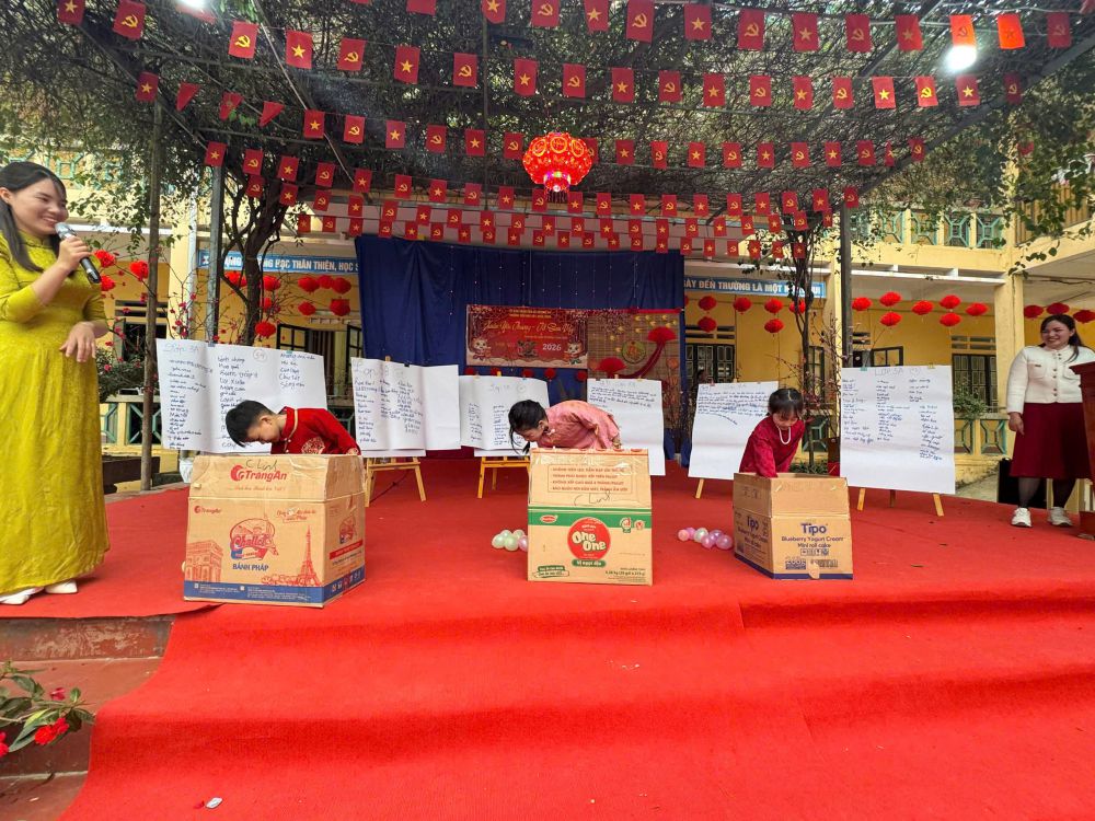 Tiếp nối chương trình là hoạt động hái bao lì xì đầu Xuân, mang đến niềm vui và sự háo hức cho các em học sinh. Mỗi chiếc bao lì xì không chỉ là món quà may mắn đầu năm mà còn gửi gắm những thông điệp ý nghĩa, những câu hỏi thú vị xoay quanh phong tục Tết và nét đẹp ngày Xuân. Qua từng phần tham gia, các em vừa được vui chơi, vừa được củng cố kiến thức một cách nhẹ nhàng, để việc học trở thành niềm vui, sự trải nghiệm đầy hứng khởi.