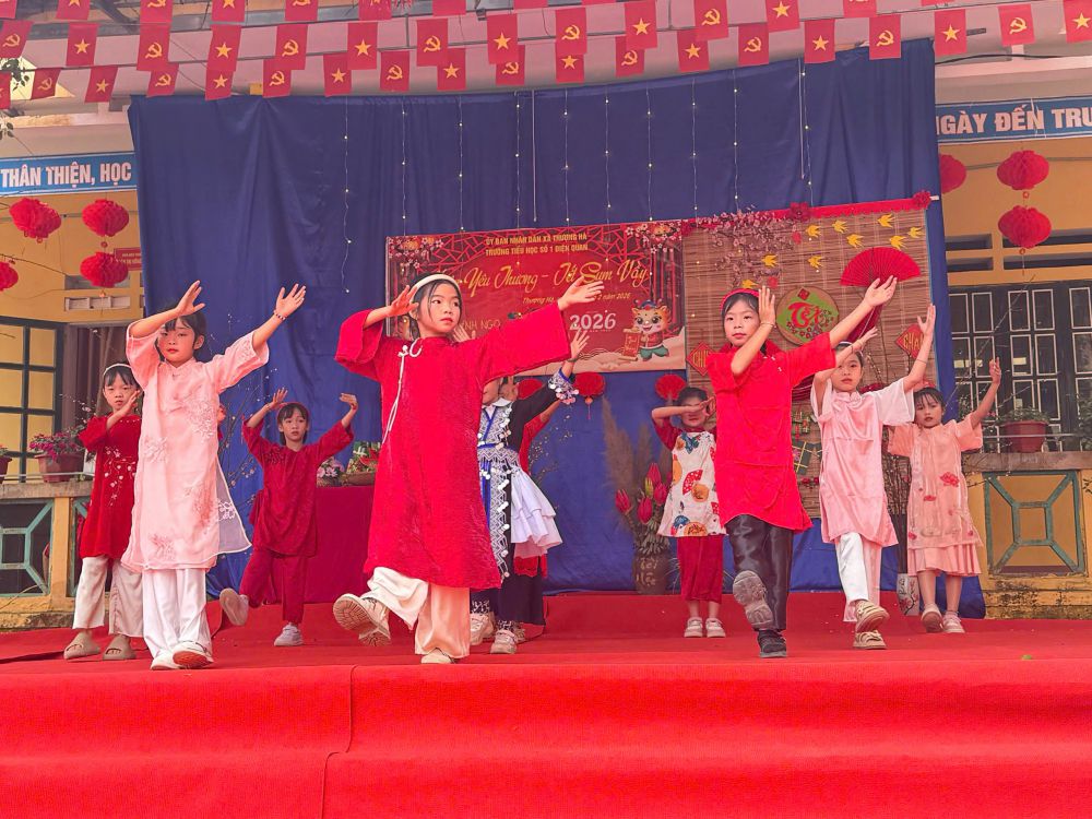 Trong không khí rộn ràng của những ngày cuối năm, khi sắc Xuân nhẹ nhàng lan tỏa khắp sân trường, Trường Tiểu học số 1 Điện Quan đã tổ chức chương trình trải nghiệm Tết cổ truyền của dân tộc dành cho học sinh với nhiều hoạt động phong phú, ý nghĩa. Chương trình được mở đầu bằng những tiết mục văn nghệ mừng Xuân rực rỡ sắc màu, mang đậm hơi thở mùa Xuân và bản sắc văn hóa truyền thống. Những lời ca trong trẻo, những điệu múa hồn nhiên, uyển chuyển do chính các em học sinh thể hiện đã làm bừng sáng không gian sân trường, lan tỏa niềm vui, sự ấm áp và háo hức chào đón năm mới.